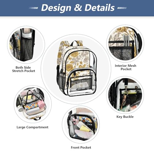 Vintage Floral White Flowers Clear Backpack for Women Boys Backpacks for Girls Large Plastic Approved Bag 4