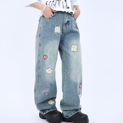 More information about Fashion Kawaii High Waisted Straight Leg Jeans for Women Y2K Cute Printed Embroidered Patchwork Denim Pants