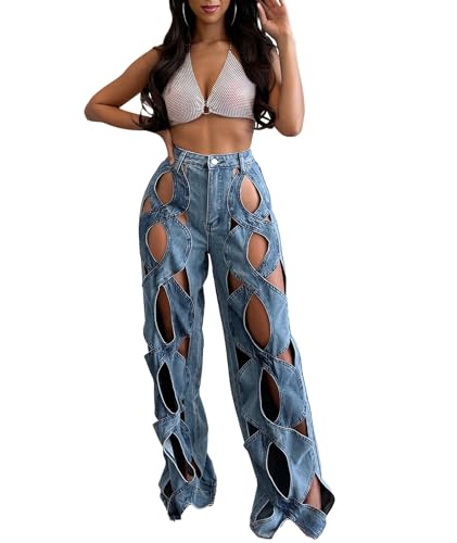 More information about xxxiticat Women's Hollow Out Denim Pants High Waist See Through Twist Together Wide Leg Loose Fit Cutout Jeans Trousers