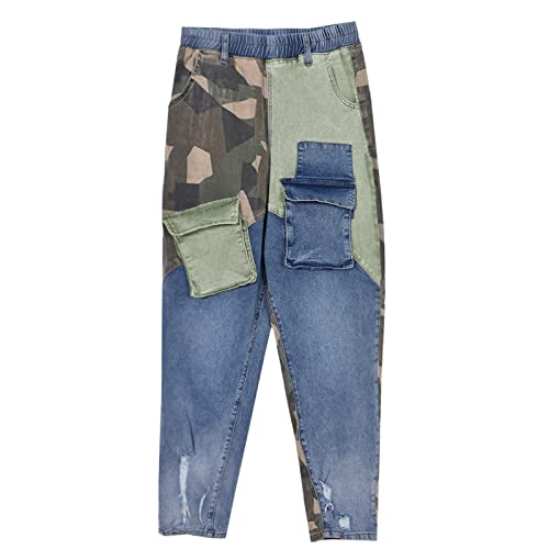 More information about Women High Waisted Boyfriend Jeans Camo Patchwork Denim Joggers Straight Leg Cargo Pants with Pockets