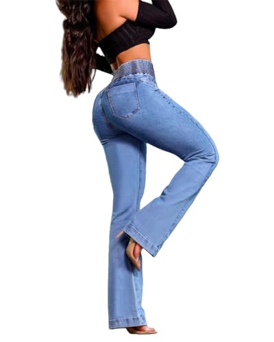HOT ! Women's Smocked High Rise Bootcut Jeans Curvy Tummy Control Stretchy Straight Wide Leg Trendy Butt Lifting Denim Pants