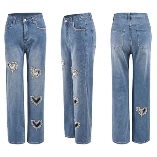More information about Womens Heart Cutout Y2K Trendy Jeans Rhinestone Straight Leg Casual Bling Denim Pants Streetwear Clubwear