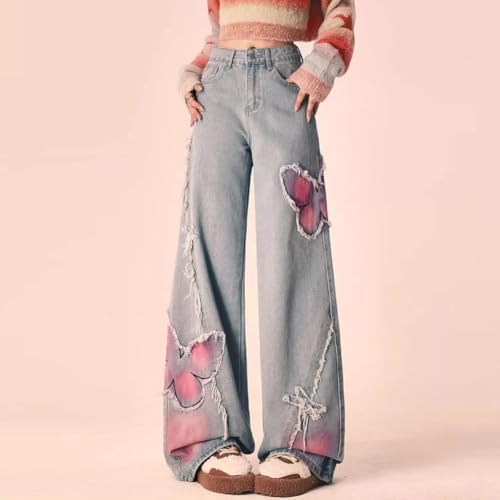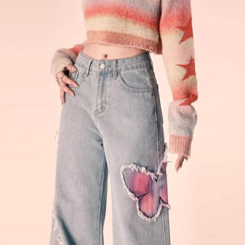 LAFOURAM Petite Jeans for Women 5 FT Short Wide Leg Baggy Coquette Butterfly Patchwork Denim Pants 5