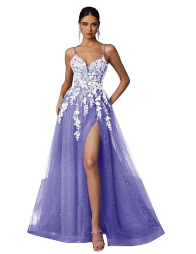 More information about Tulle Prom Dresses 2025 Puffy Ball Gown for Women Formal V Neck Lace Appliques Evening Gown with Slit Long Homecoming Dress