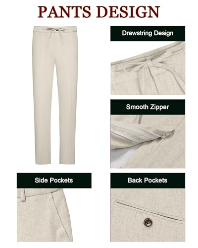 Retro Linen Mens Suit 2 Piece Slim Fit Linen Suits Set Tuxedo Blazer Jackets Drawstring Pants Summer Wedding Prom Tux for Men 4