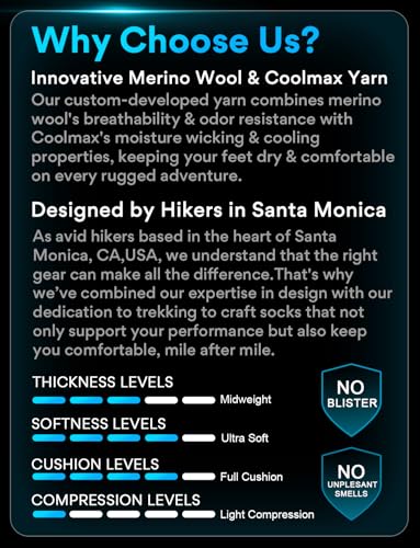 • 【Dual-Action Moisture Control】 Advanced Coolmax and Merino wool blend wicks moisture faster than pure Merino, Keeping feet warm while offering better moisture wicking and a more breathable feel than standard wool, so your feet stay dry, fresh, and comfortable all day.