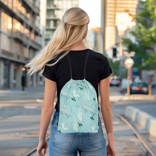 Erosebridal Manatees Draw String Back Bag 13x15.7,Cartoon Manatee Drawstring Bags,Marine Ocean Life Teal Drawstring Backpack,Manatee Family Underwater World Foldable Cinch Bag for Swim Yoga Camping 5