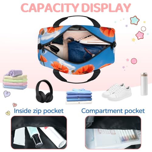 Red Poppy Pattern Sports Duffle Bag for Women Men Waterproof Overnight Weekender Bag with Adjustable Strap Travel Tote Bags for Beach Yoga Work Dance Swim 7