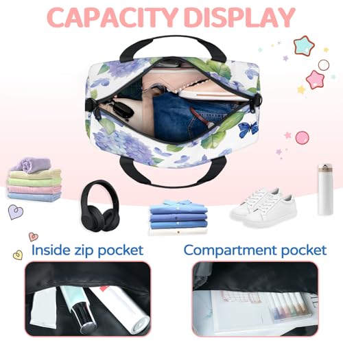 Watercolor Blossoms Hydrangea Sports Duffle Bag for Women Men Waterproof Overnight Weekender Bag with Adjustable Strap Travel Tote Bags for Beach Yoga Work Dance Swim 5