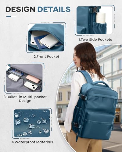 • 📦Waterproof & Design - This travel backpack is made of high-density waterproof material to keep your belongings dry and protected. In addition, there are luggage straps on the back that allow the backpack to be secured to a luggage rack and provide convenience.