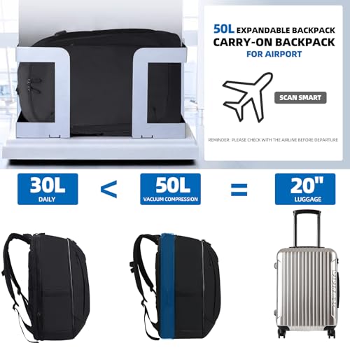 • Smart Expandable Capacity: This expandable backpack for travel transforms from a compact (13 × 7.5 × 20 inches / 33 × 19 × 51 cm) carry-on vackpack (meets common airlines flight requirements) to a spacious 50L pack offering the storage equivalent of a 20" suitcase without the bulk - ideal for mountain hiking or urban traveling