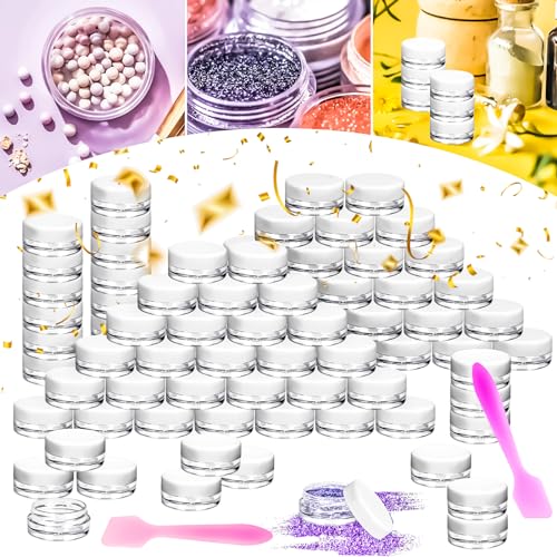 MotBach 100 Pcs 3g Empty Plastic Containers with White Lids,Tiny Makeup Sample Containers, Small Pot Jars Clear Round Cosmetic Jars with 20 Pcs Mini Spatulas for Liquid Sample Powder Creams 4