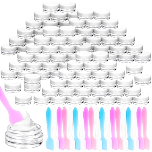 HOT ! MotBach 100 Pcs 3g Empty Plastic Containers with White Lids,Tiny Makeup Sample Containers, Small Pot Jars Clear Round Cosmetic Jars with 20 Pcs Mini Spatulas for Liquid Sample Powder Creams