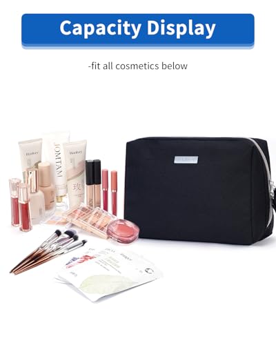 • WELL-ORGANIZED COMPARTMENTS. Practical main compartment with 5 inner small pockets could neatly organize your makeup. Main compartment could easily hold travel-size toiletries or skin-care products. It could fit 3 brushes, eyeliners, foundation, concealer, lipsticks, blushes, powder, eyeshadow pallet, mascara, lash curler, sponges, sunscreen, 3oz lotion, cream, facial cleanser and toothpaste