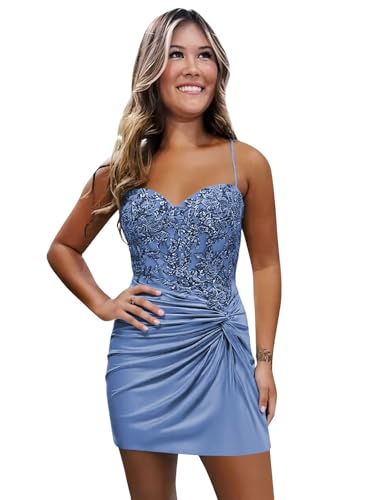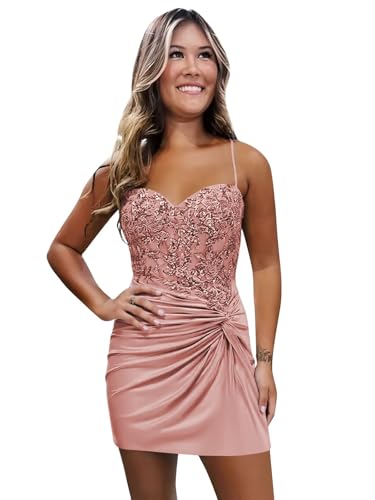 • Features:Sparkly satin homecoming dresses for teens,adjustable spaghetti strap,sweetheart neckline,sleeveless,lace applique sequins,ruched pleated corset design,mini short above knee,open back,built-in bra