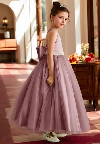 • STYLE DESIGN: Tulle flower girl dress features with Pearls, V-neck, backless, bow, back zipper closure, A-line floor length. Your girls will love this pageant ball gown beautiful dress