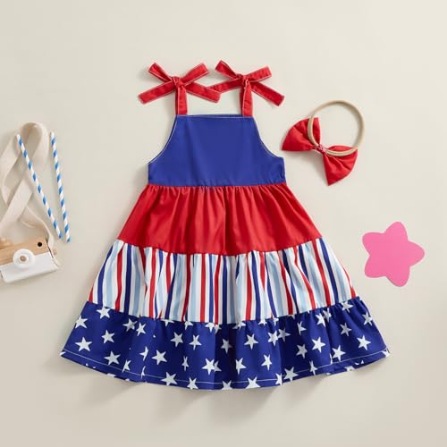 • Design: 4th of july baby girl outfits,sleeveless backless dress,spaghetti strap ice cream/stars ans stripes/american flag print Independence Day princess dress,red and bule bow headband, kids girls fourth of july dress.Baby girl 4th of july outfit,4th of july dress toddler girl,little girl 4th of july outfit,red white and blue dress.
