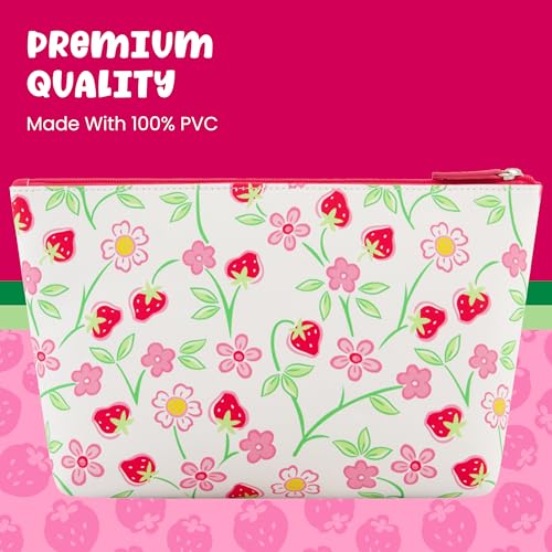 • ZIP MAKEUP BAG: This cute and fashionable make up bag features Strawberry Shortcake in a heart-shaped design surrounded by strawberries and flowers, and sleek pink and silver hardware, making this cosmetic purse a stylish and practical way to keep your makeup accessories and toiletries easily accessible while on the go