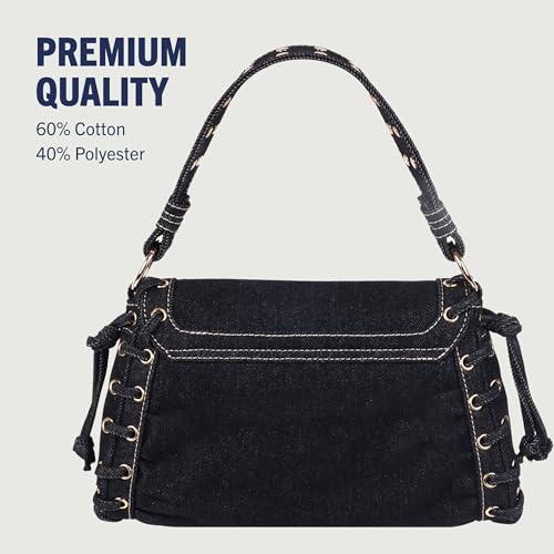HOT ! True Religion Studded Horseshoe Eyelet Denim Flap Bag, Crossbody Shoulder Handbag, Black