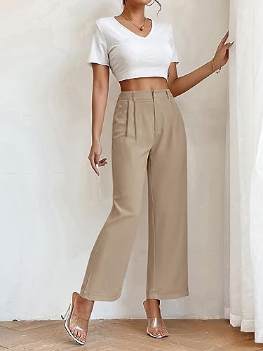 HOT ! SweatyRocks Women's High Elastic Waist Zip Up Pleated Pants Casual Straight Leg Solid Dress Pants