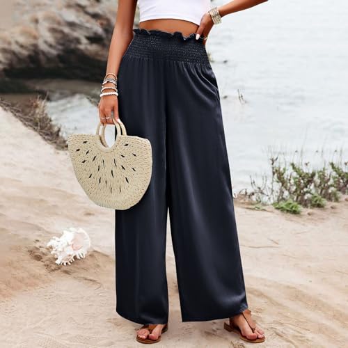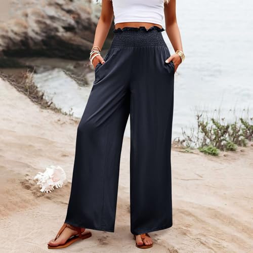 More information about Womens Summer Pants Baggy Trendy High Rise Wide Leg Pants Palazzo Stretch Elastic Solid 2025 Outfit Ruched with Pocket