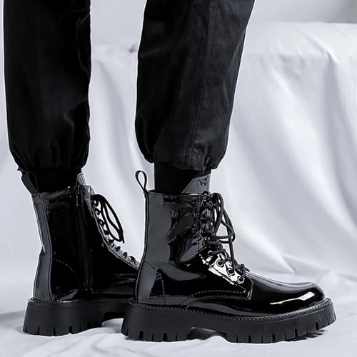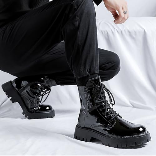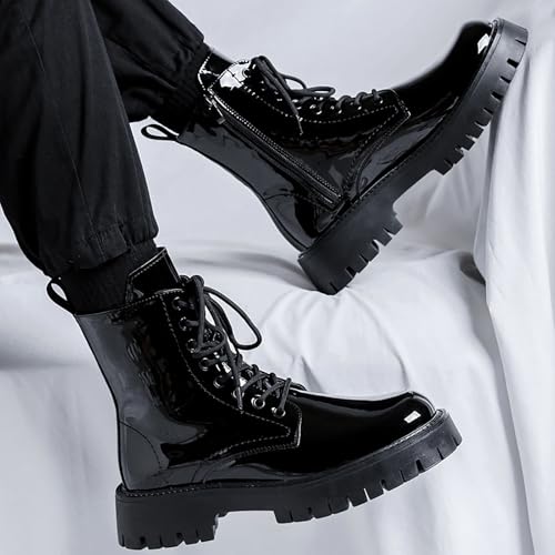 Men'S Black Patent Leather Platform Combat Boots Fashion Side Zipper Wide Toe Lace Up Chunky Lug Sole High Top Motorcycle Boots Comfort Waterproof Non-Slip Casual Ankle Booties 6