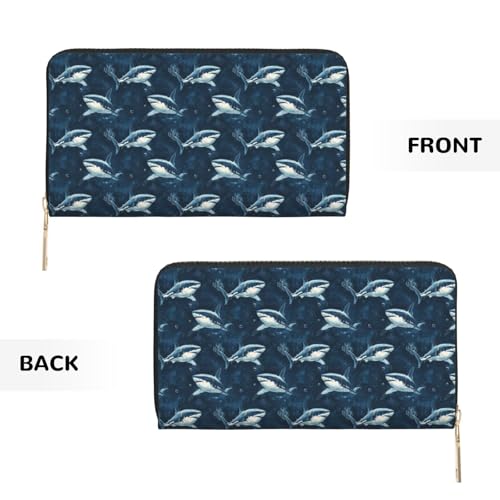Leather Thin Slim Wallets for Women Men - Fashion Navy Blue Shark Print Card Wallet Holder with Zipper 7