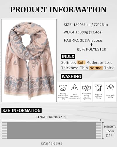 • Pashmina Scarf Size: length 72 in (71 in+0.5 in fringes each side), width 26 in; The oversized scarf can be used as shawl, head wrap, and even throw blanket