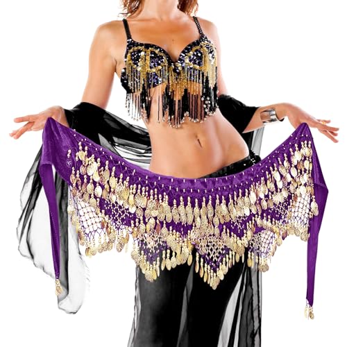 Belly Dance Hip Scarf, Women's Chiffon Belly Dancing Scarf with 300 Gold Coins for Yoga Class 5