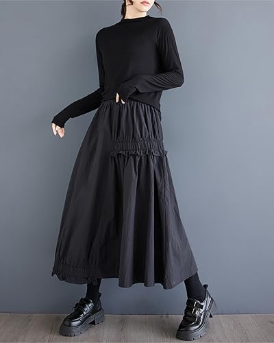• Features: This women's skirt is designed with an elastic waistband for a comfortable and adjustable fit. The solid color makes it versatile for different outfits. It includes two side pockets for practicality, and the flowy ruffle hem adds a stylish, feminine touch. The baggy, loose fit ensures a relaxed, comfortable look