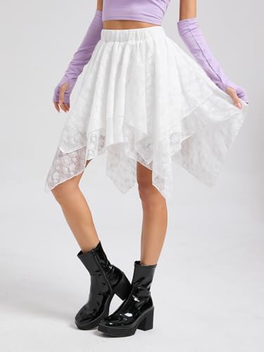 • Features: Lace, tiered ruffle, elastic high waist, asymmetrical hem, flared, solid, short skirts for women