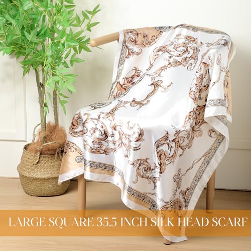 SATINIOR 35 Inch Silky Head Scarf 2 Pcs Large Square Neck Scarf Sleeping Hair Wrapping Satin Bandana for Women(Beige,Lovely Style) 2