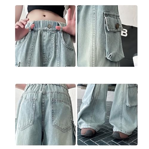 Girls Casual Cargo Jeans Wide Leg High Elastic Waist Ripped Distressed Washed Denim Pants with Pockets 4