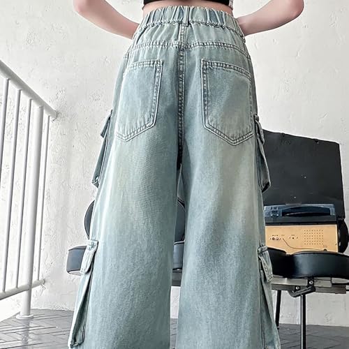 Girls Casual Cargo Jeans Wide Leg High Elastic Waist Ripped Distressed Washed Denim Pants with Pockets 5