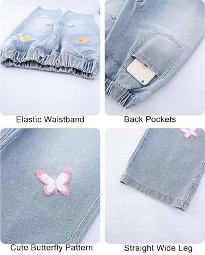 Girl’s Baggy Cute Jeans Elastic Waist Y2K Butterfly Embroidered Wide Leg Pull On Denim Pants for Kids 4