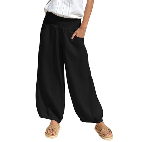 HOT ! Linen Pants Women Smocked Elastic Waist Casual Summer Palazzo Pants Boho Baggy Wide Leg Trousers with Pockets