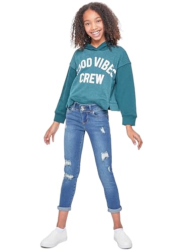 YMI Jeans Girls Sustainable WannaBettaFit 2-Button Double Cuffed Skinny Jeans, Tinted Blue Rips, 10 5