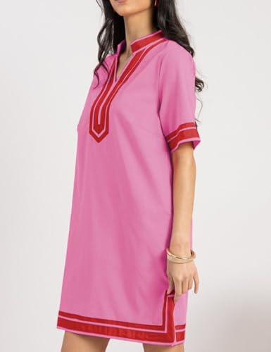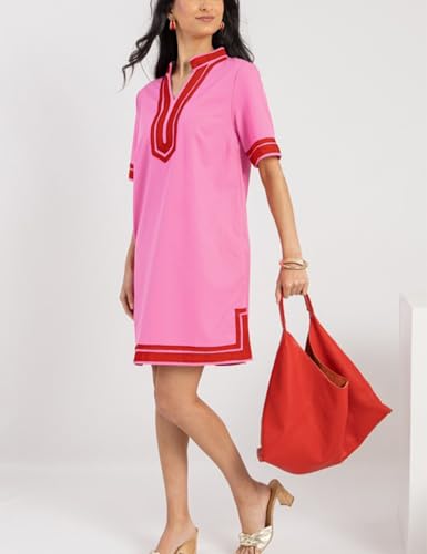 • Features:women loose fit dress with contrast trim,ribbon contrast border,small side slits,two side pockets,v neck,pretty style features a shift silhouette with a split neckline and short sleeves