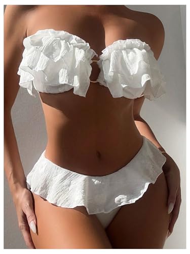 SweatyRocks Women's 2 Piece Bandeau Swimsuit Ruffle Trim Ring Bikini Set Strapless High Cut Bathing Suit 2