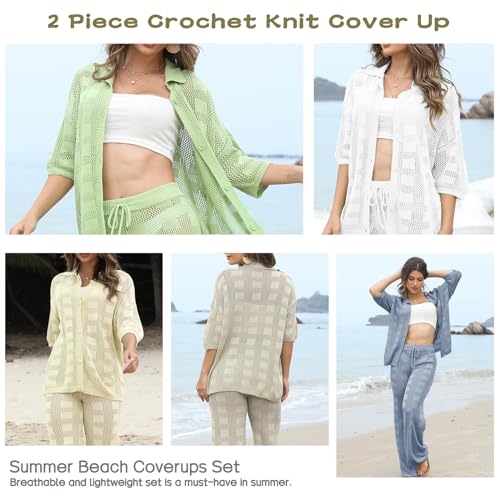Famulily Womens 2 Piece Crochet Knit Cover Up Summer Beach Coverups Set with Short Sleeve Button Tops and Long Pants 2