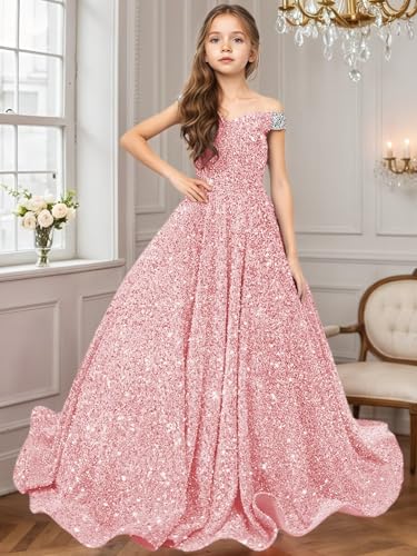 Sequin Flower Girl Dresses for Wedding Off Shoulder Princess Pageant Dress Girls Birthday Party Ball Gown 6