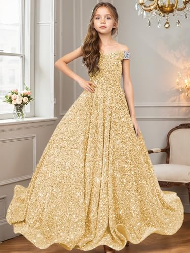 • Features: Off Shoulder Sequin Flower Girl Dress Ball Gown,Sparkly Sequin flower girl dress for wedding pageant formaldresses, Giltter,Floor length, Long prom dress for teen ,girls formal dress, Sequin Pageant Gown