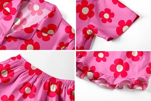 Umeyda Girls Satin Silky Collar V Neck Ruffle Short Sleeve Top and Shorts Sleepwear PJs, Rose Red Flower, 9-10 Years 6