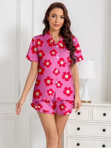 Umeyda Girls Satin Silky Collar V Neck Ruffle Short Sleeve Top and Shorts Sleepwear PJs, Rose Red Flower, 9-10 Years 1