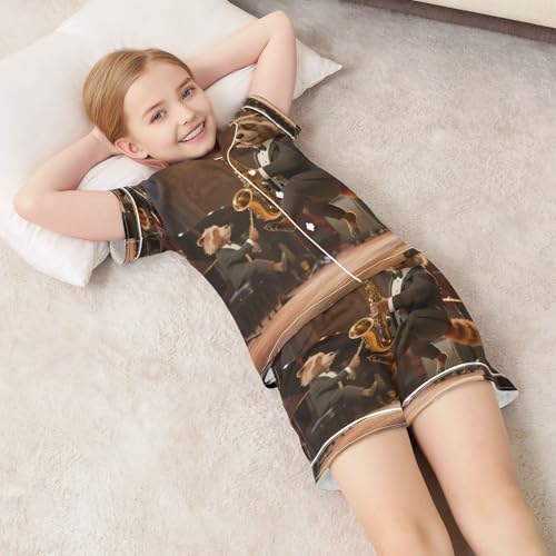 Satin Pajama Sets Short Sleeve Animals Playing Music on Stage Button Down Silky Nightwear 2 Piece PJS 5-14Y 7