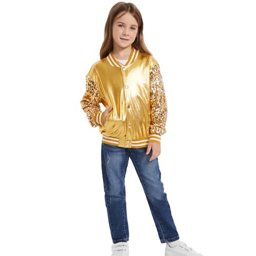 Girl Sequin Jacket Kid Sparkly Varsity Jackets Long Sleeve Lightweight PU Bomber Cardigan Metallic Shiny Coat 6