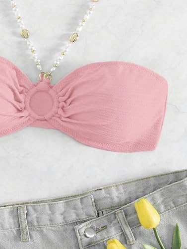 • 【DESIGN】 This high waisted bikini sets for women features a halter top with pearl chain detailing and ring-linked accents, paired with high-waisted triangle bottoms in a textured fabric for a sexy, vacation-ready look. The bandeau-style top offers optional strapless wear, blending halter elegance with bold ring details.