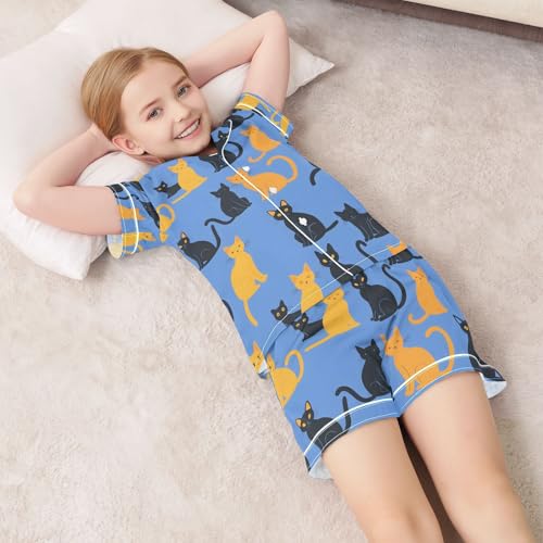 ALAZA Blue Yellow Cat Kitten Pajamas Satin Pajama Set Short Sleeve Button Down Sleepwear 3