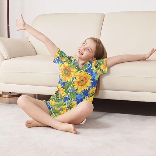 ALAZA Sunflower Blue Pajamas Satin Pajama Set Short Sleeve Button Down Sleepwear 3