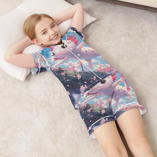 Satin Pajama Sets Short Sleeve Cute Axolotl Pink Cherry Blossoms Button Down Silky Nightwear 2 Piece PJS 5-14Y 6